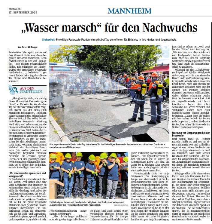 Seit die Mannheimer Lions im Jahr 2017 aus Anlass des 100-jährigen Jubliäum der LIONS die Gründung der Kinderfeuerwehr unterstützt hat, besteht eine enge Bindung zur Feuerwehr. In diesem Jahr haben wir uns entschlossen, die Gründung einer weiteren Gruppe der Kinderfeuerwehr, der sogenannten Löschlöwen in Mannheim-Feudenheim zu unterstützen. Mit der Spende konnten die notwendigen Ausrüstungsgegenstände für die Feuerwehrleute der Zukunft, wie Helm, Handschuh oder Leinenbeute beschafft werden.