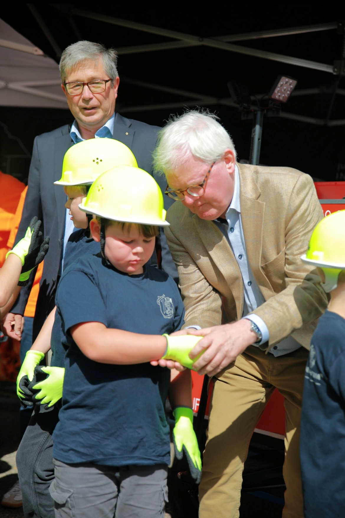 Unser Präsident Reiner Neumann und unser Schatzmeister Thomas Steitz waren direkt vor Ort, als die stolzen Löschlöwen ihre neue Ausrüstung in Empfang nehmen konnten und überzeugten sich von der großen Motivation der Kinder und dem bereits gelernten. Überall gab es nur strahlende Gesichter bei der Übergabe !